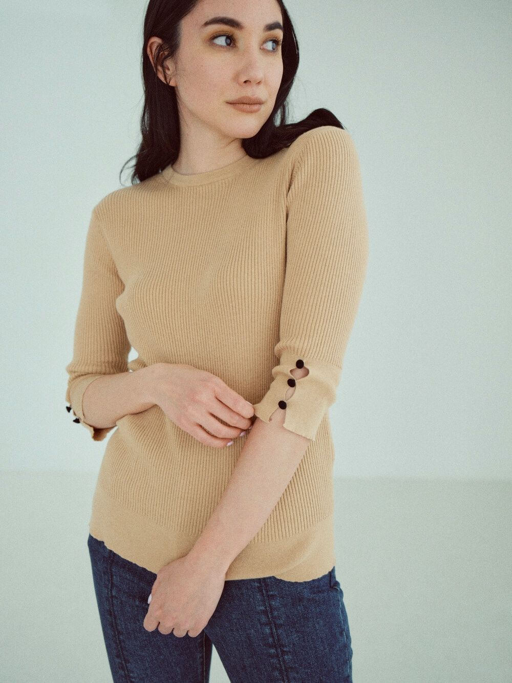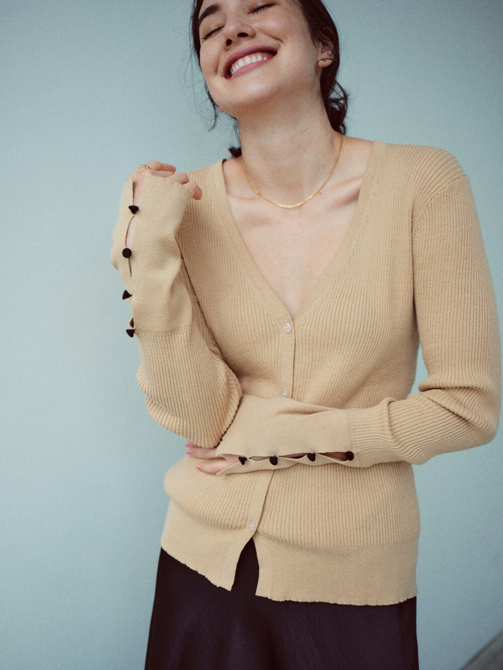 フェミニティ香るスカートに合わせれば抜け感に、いつものデニムに合わせればスタイルに品をプラスしてくれるニットシリーズ。袖にあしらった飾りボタンは、大人の遊び心を表現します。また、ツインニットとして着るのもおすすめです。その日の気分とアイディアによってさまざまに表情を変える、大人にこそ楽しんでほしいアイテムです。