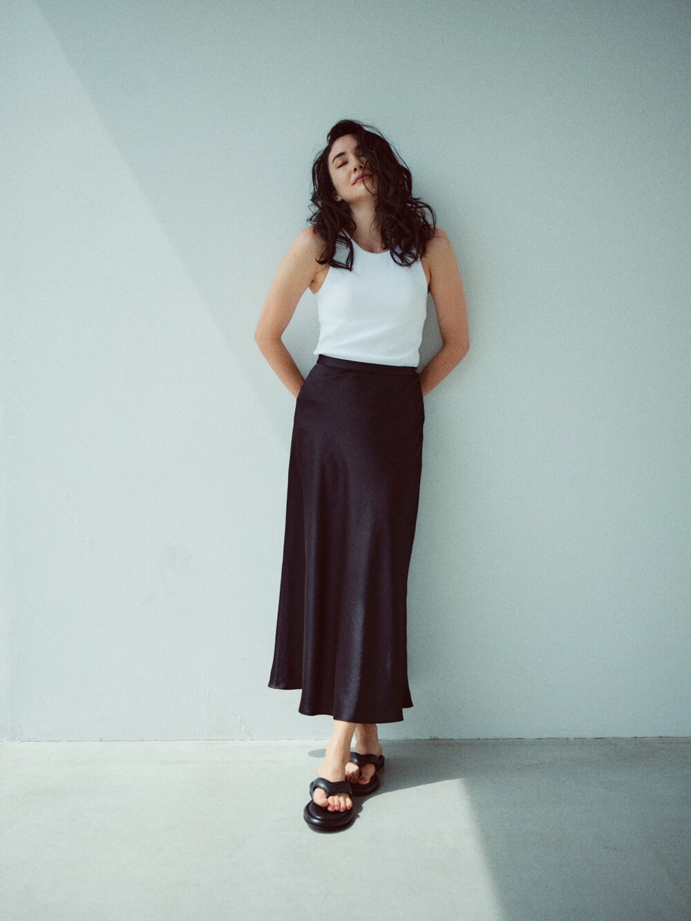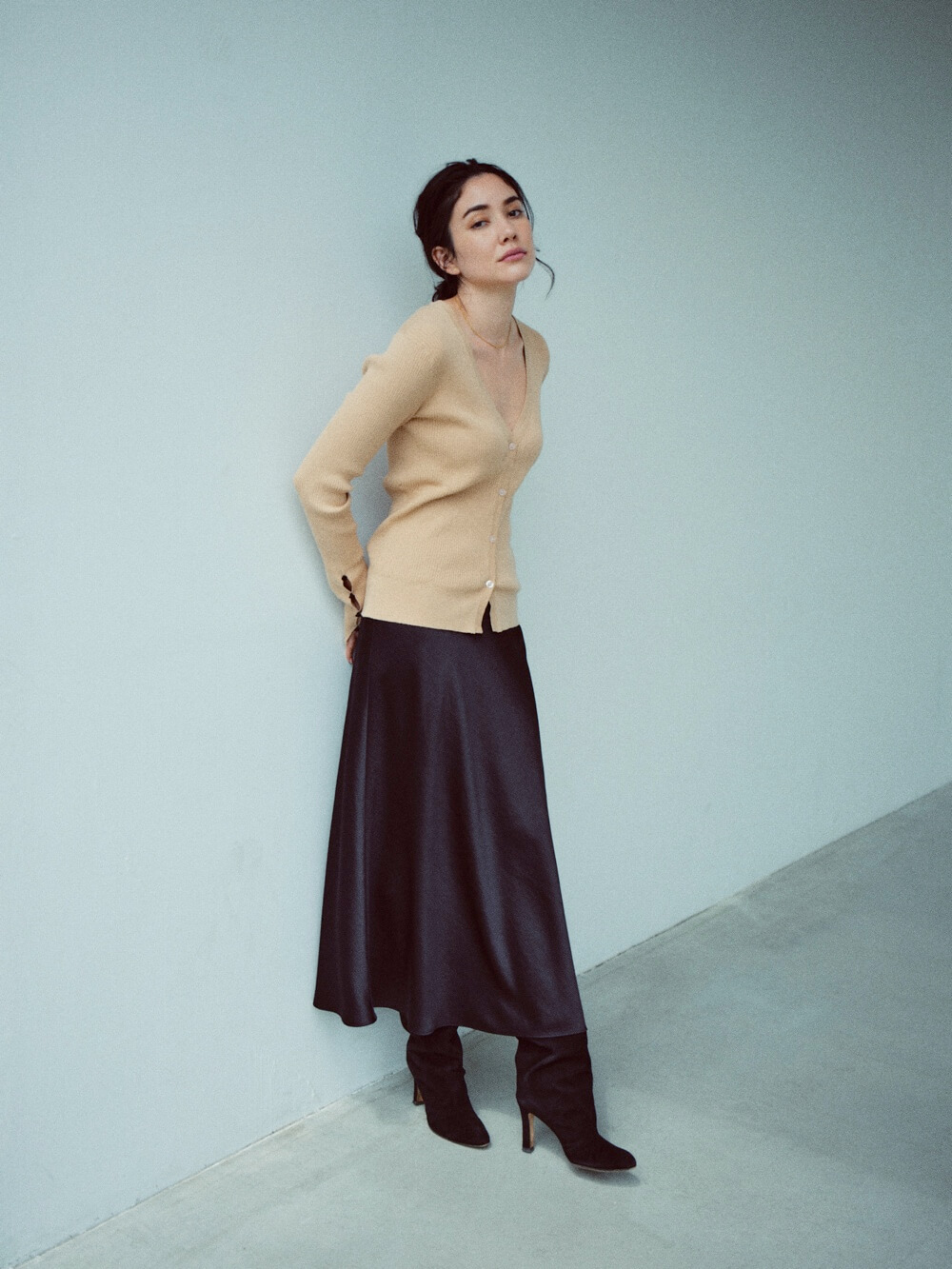 ドレープがひるがえるエレガントなスカートを着こなせるのは、大人だけの特権。シックなツヤを持つヴィンテージライクなサテン地を使った、すっきりとしたラインのロングスカートです。甘すぎないデザインは、シーズンだけでなく、合わせるアイテムも選びません。何者にも媚びない、私たちらしいアティテュードを表現するアイテムです。
