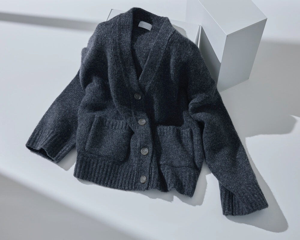 夏の肌寒い海辺で、冬の冷える日に、そっと寄り添ってくれるのは上質なカシミヤカーディガン。カシミヤの太い糸を贅沢に2本取りにし、たっぷりの空気を纏わせて編み上げました。ずっしりとした肉厚さを持ちながら、着心地はふんわりと軽く温かい理想的な一枚です。自分だけのマイヴィンテージとして10年後も着ていただけます。